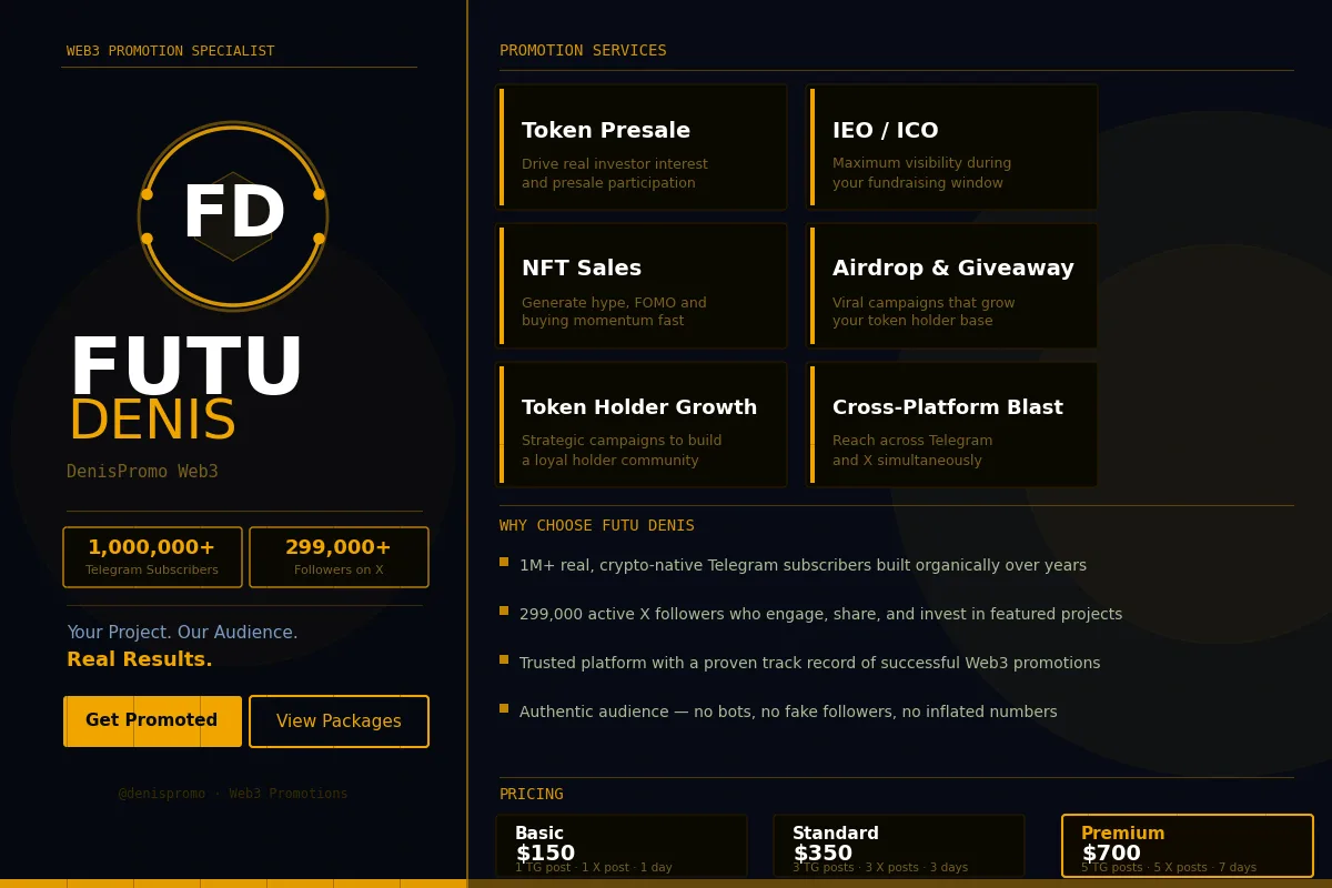 My name is Futu Denis, and I am an experienced Crypto & Web3 Promotion Specialist with a highly engaged audience of over 1 million Telegram channel subscribers and 299,000 followers on X. I have built one of the most powerful and authentic promotion platforms in the Web3 space — a community of real, crypto-native investors, traders, and enthusiasts who are actively looking for the next great opportunity. When you promote with me, your project lands directly in front of the right people at the right time.