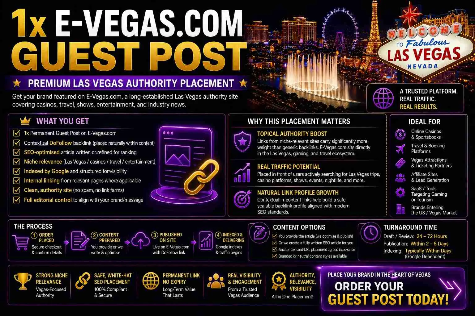 Do you need a powerful, permanent guest post on a real Las Vegas website with genuine authority and niche relevance? This is your opportunity to secure a high-impact placement on E-Vegas.com — a premium, aged Las Vegas domain with strong branding, real history, and powerful SEO value. Unlike generic link farms, this is a niche-relevant, location-targeted asset that gives your backlink real weight where it matters.