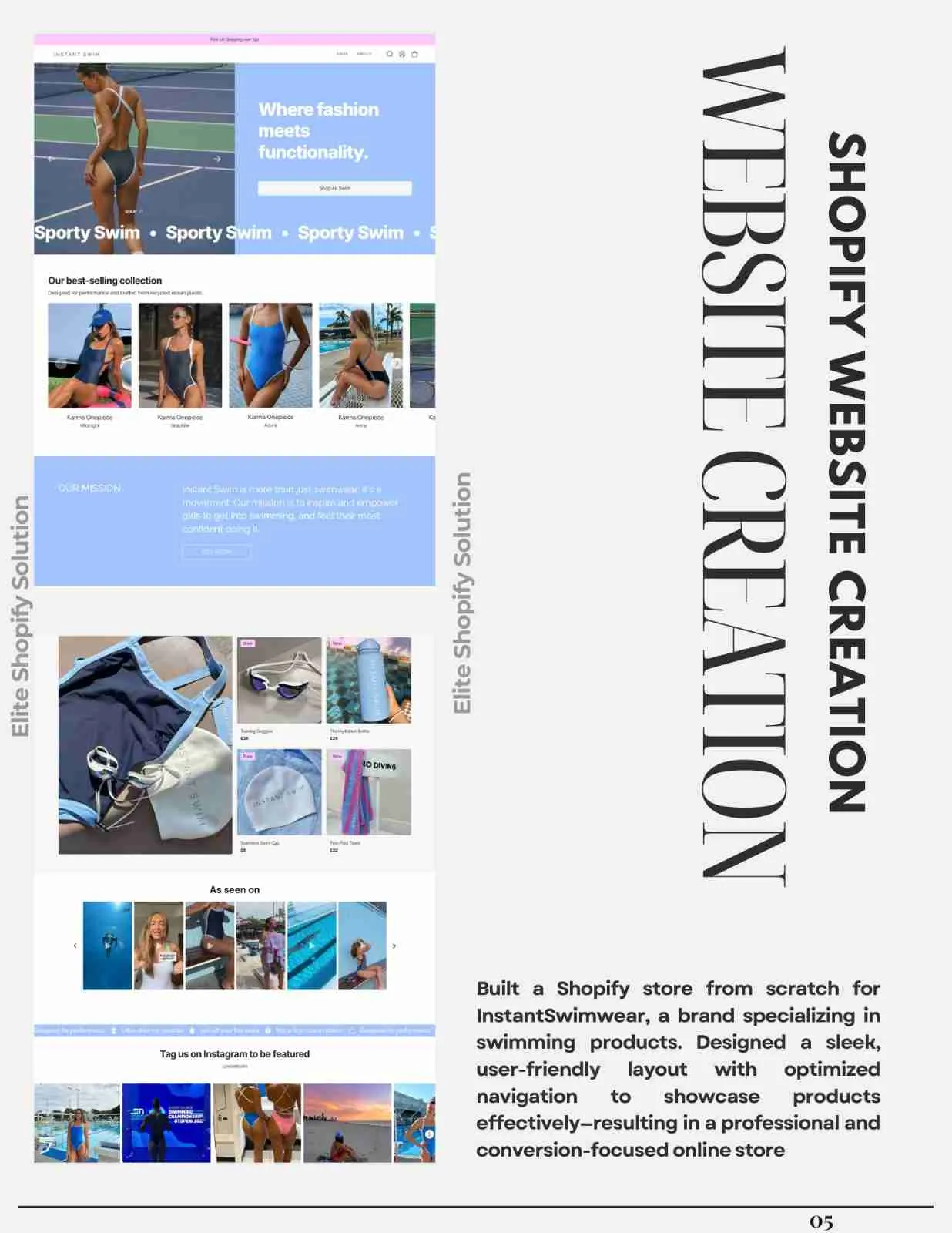Built a Shopify store from scratch for InstantSwimwear, a brand specializing in swimming products. Designed a sleek, user-friendly layout with optimized navigation to showcase products effectively—resulting in a professional and conversion-focused online store