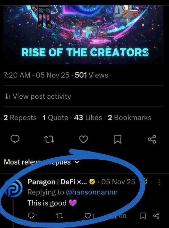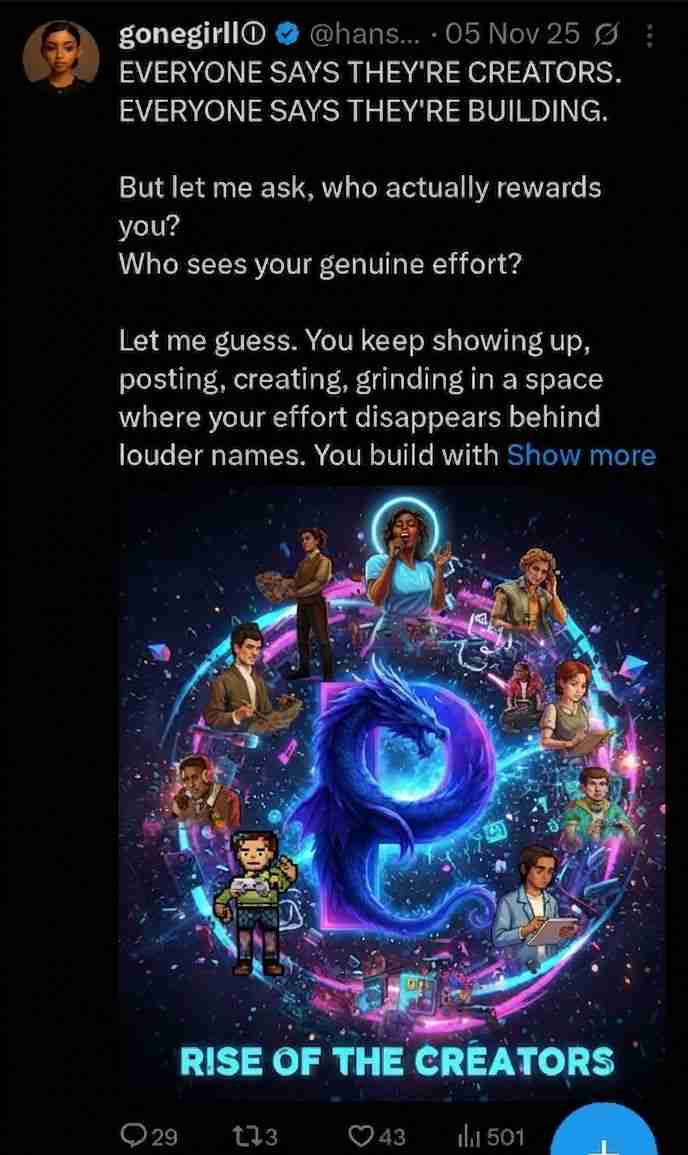 Wrote a thought leadership piece for a Web3 creator campaign addressing visibility and reward gaps in crypto spaces. The piece generated 43 likes, 501 impressions and a recognition from the project.
