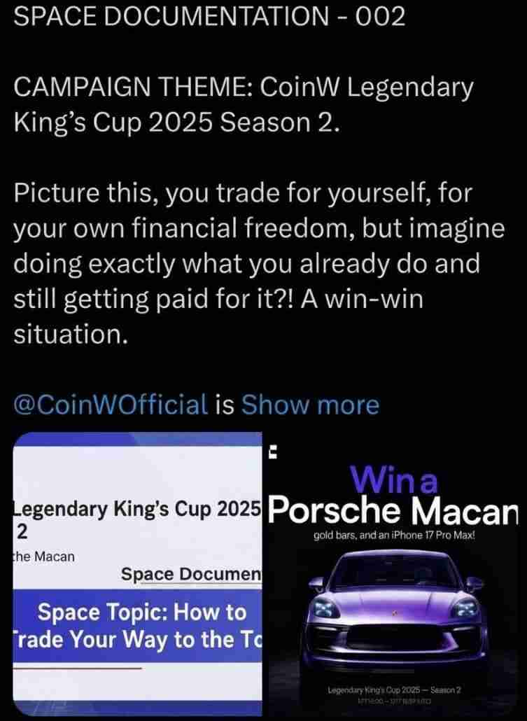 Documented an X space: a campaign piece for CoinW's Legendary King's Cup Season 2, positioning the trading competition as a personal financial opportunity.