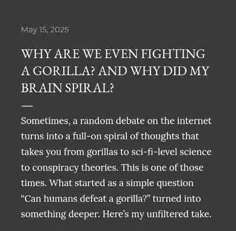 Opinion Writing: Why Are We Even Fighting A Gorilla? And Why Did My Brain Spiral? I wrote an unfiltered opinion piece on a blog that turned a viral internet debate into a deep intellectual exploration spanning science, human psychology, and conspiracy theories. This demonstrates my ability to take any topic and build a compelling and readable narrative around it.