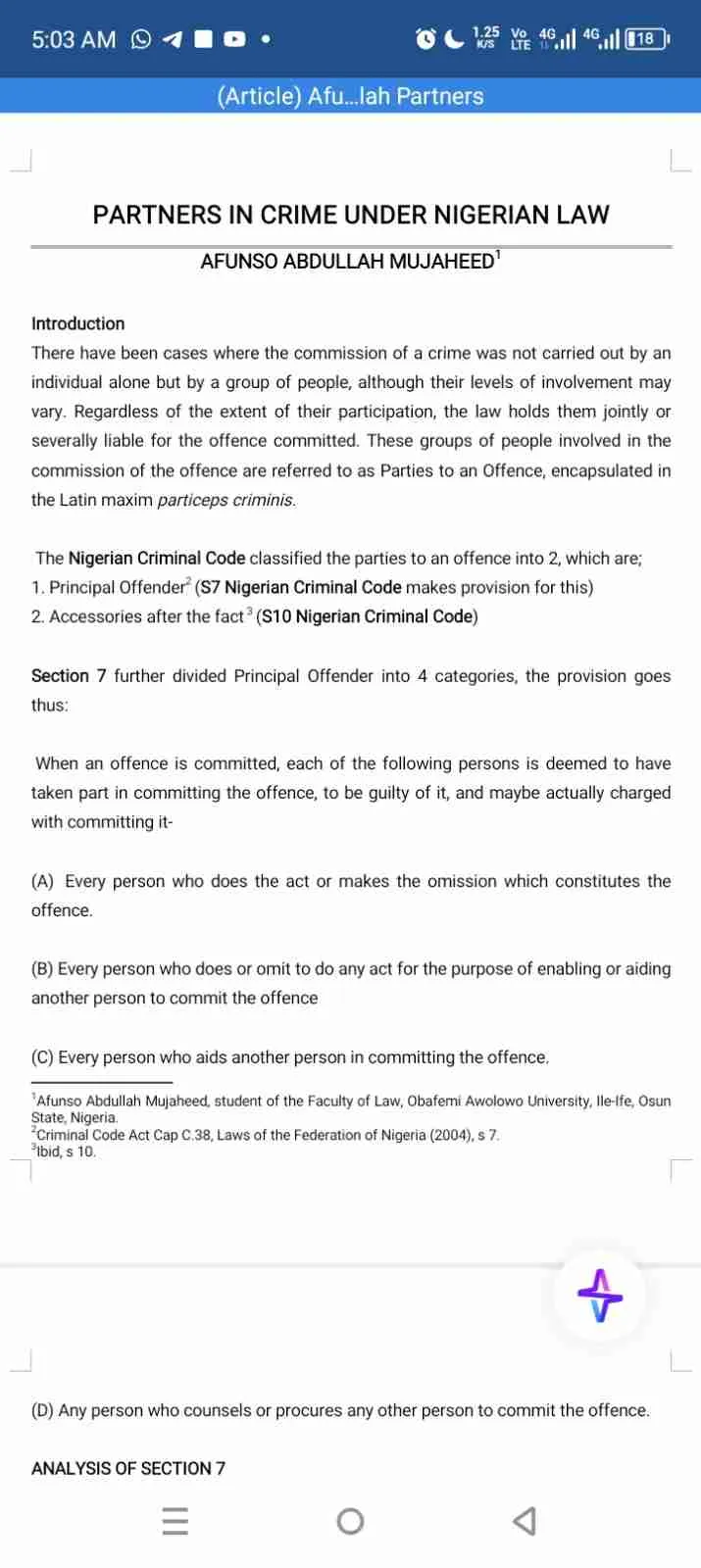 An original legal article analysing the doctrine of parties to an offence under Nigerian criminal law. Examines Section 7 of the Criminal Code Act Cap C.38, with detailed breakdown of principal offenders and accessories after the fact. Submitted and accepted as a valid academic project at my internship.