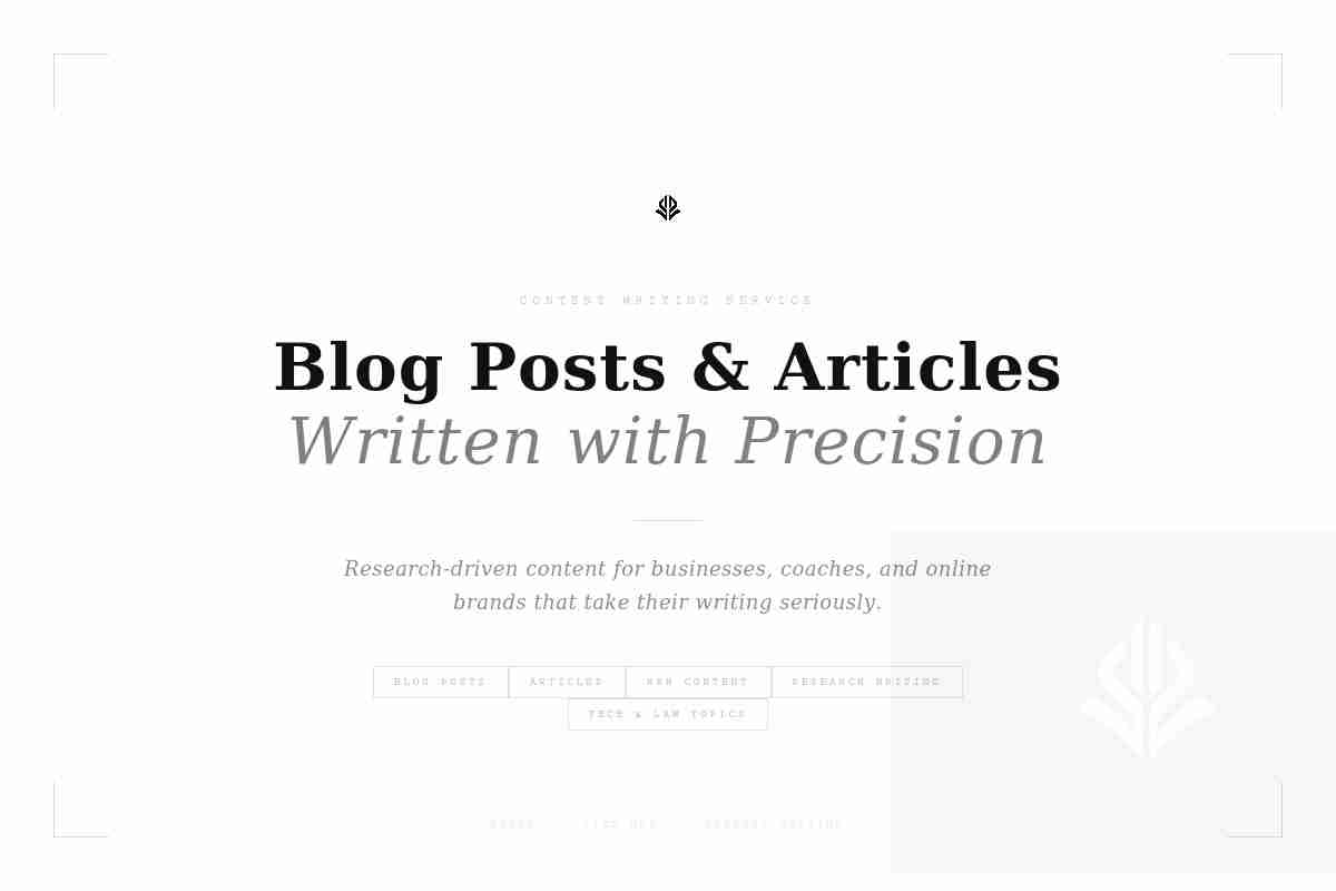 Research-driven contents and articles written with legal precision. If you need content that is clear, well-structured, and properly researched, this is the service for you.