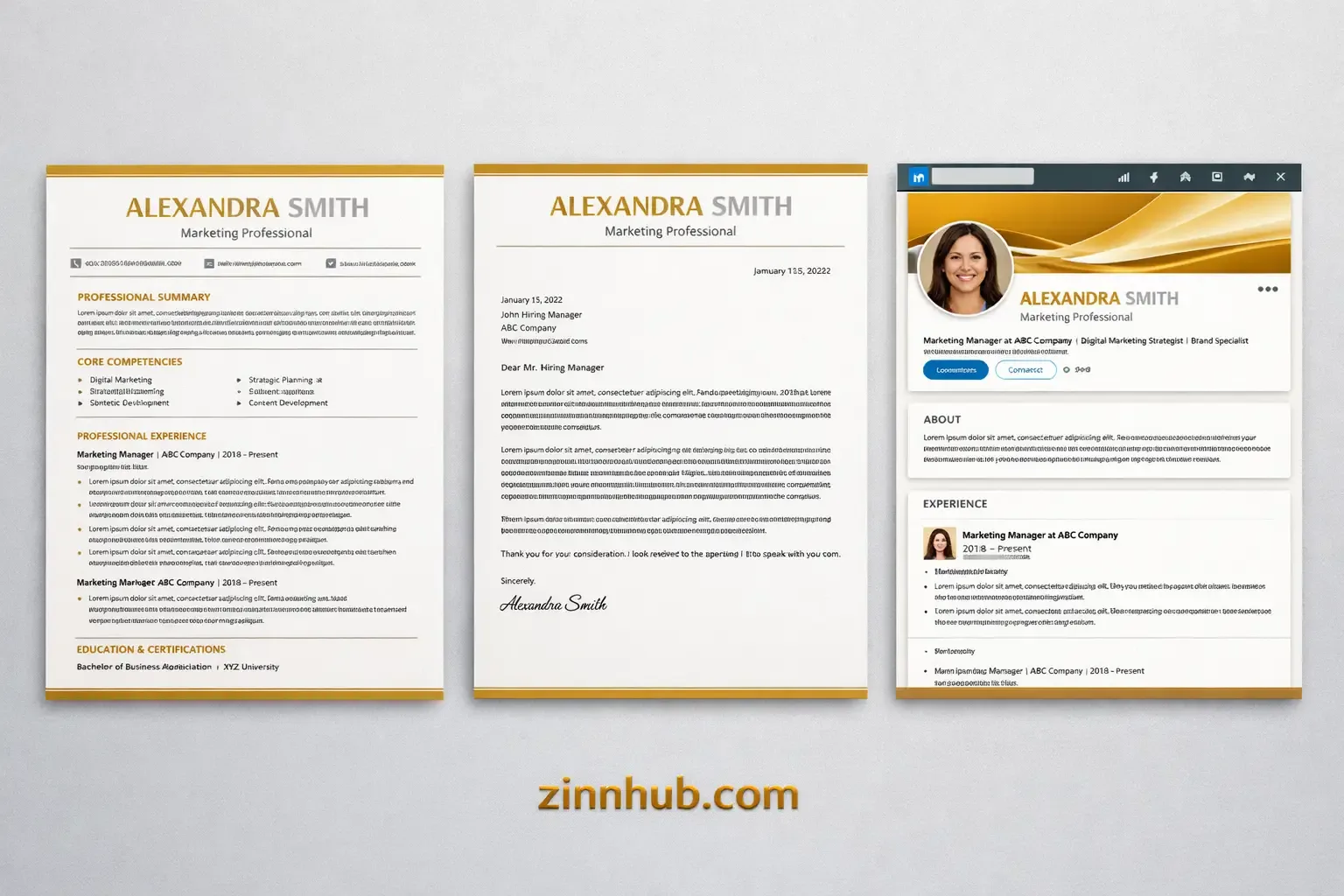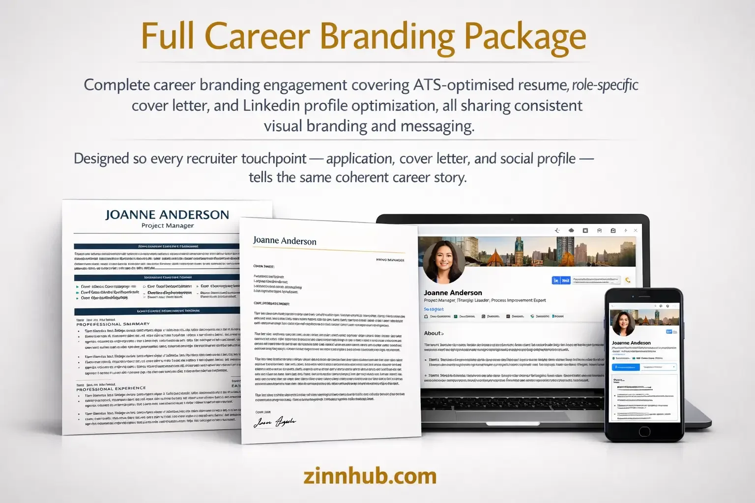 Complete career branding engagement covering ATS-optimised resume, role-specific cover letter, and LinkedIn profile optimisation, all sharing consistent visual branding and messaging. Designed so every recruiter touchpoint — application, cover letter, and social profile — tells the same coherent career story.