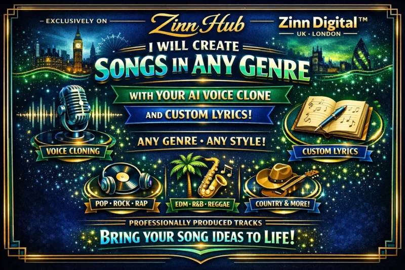 Step into the world of AI-generated music, where every melody is personalised to tell your unique story. Whether you need a joyful birthday song, a heartfelt romantic ballad, or a fun children's tune, my custom tracks are designed for any occasion. With lengths ranging from 2 to 6 minutes, Zinn Digital ™'s service combines AI innovation with a personal touch to capture the essence of your moment.