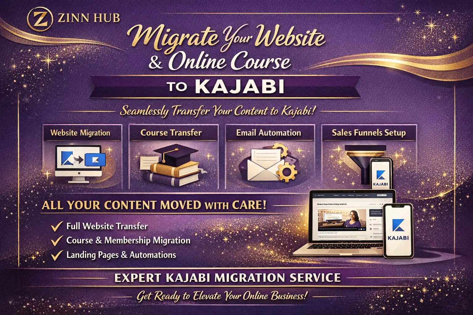 In this Zinn, Zinn Digital ™ will help migrate your website to Kajabi. If your current site is on WordPress, Wix, Squarespace, Thinkific, Kartra, Weebly, or any other platform and you're looking to transition to Kajabi, this service is for you.