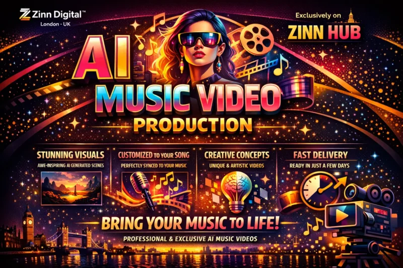 Welcome to the future of music videos! I'm Zinn Digital ™, here to turn your tunes into unforgettable visual experiences using cutting-edge AI technology. Based in London, England, we're at the forefront of creative innovation.