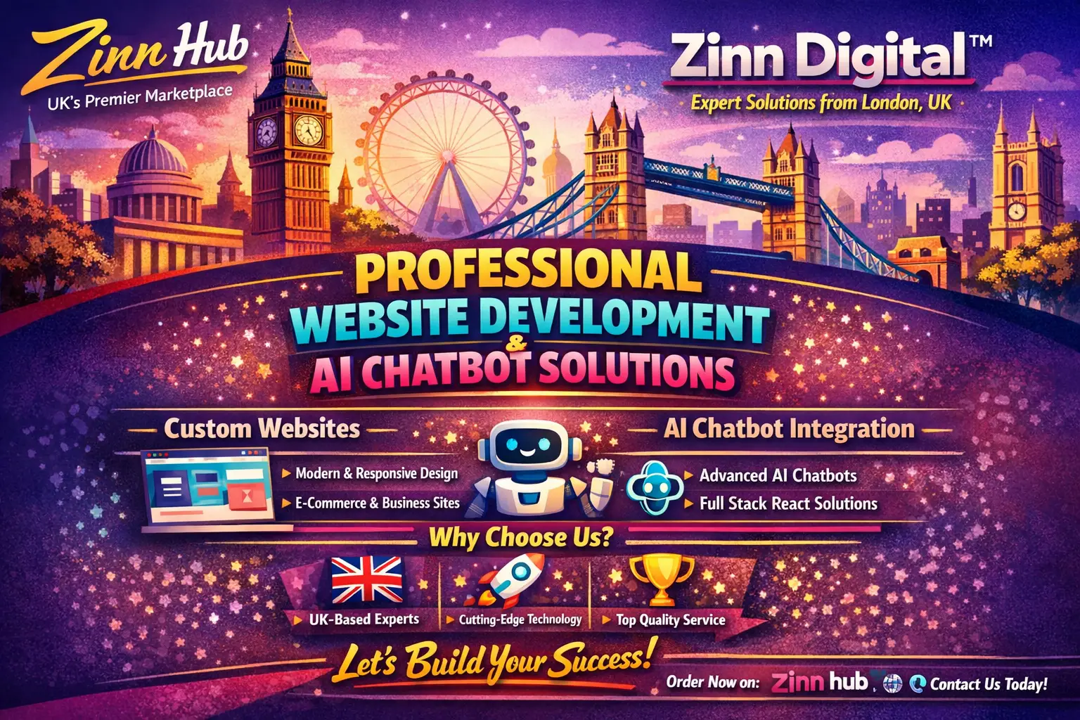 We create unique, eye-catching, bespoke websites to match your vision. As full-stack developers based in London, England, we handle everything from design to functionality, ensuring a seamless experience. We also integrate intelligent AI chatbots to boost user interaction and provide instant support. Let's create a website that's beautiful, intelligent, and engaging!