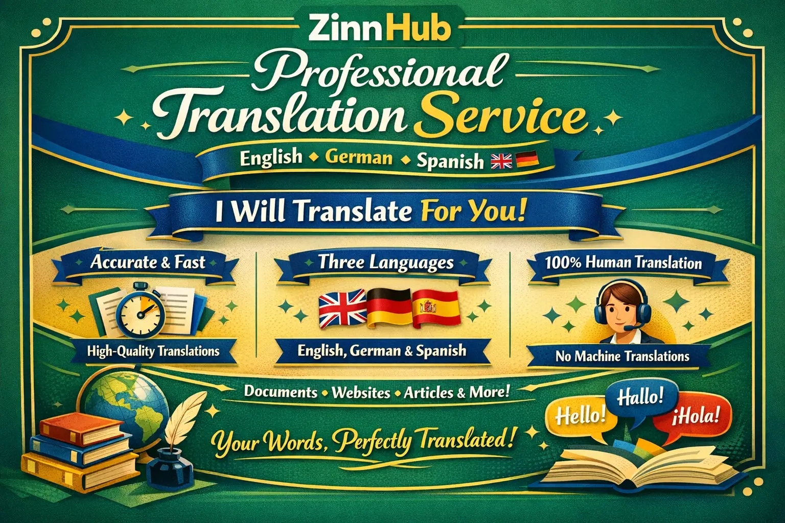 Hello and welcome to my Zinn. I am part of Zinn Digital ™ and I will be your professional translator. With over 10 years of experience and 5500+ completed orders based in London, England, I can translate almost all topics. My reviews speak for themselves with 2700+ positive reviews.