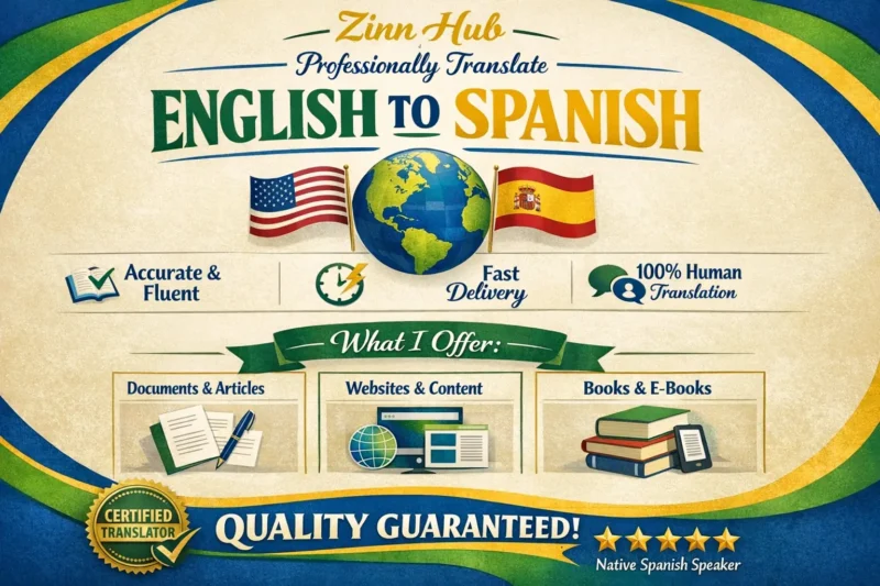 Hello, I'm from Zinn Digital ™. Based in London, England, I'm a native Spanish speaker with years of experience as a translator. I will translate any document from English to Spanish. I do not use translation software; everything is completed manually to ensure accuracy.