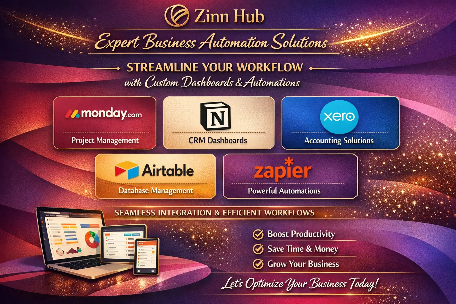 Zinn Digital ™ is a professional Project Manager specialising in building, organising and managing systems using Monday CRM, Notion, Airtable and Xero. Whether you're a startup, entrepreneur, or growing business, we create simple, efficient and automated workflows that save you time and boost productivity. Our team is based in London, England.