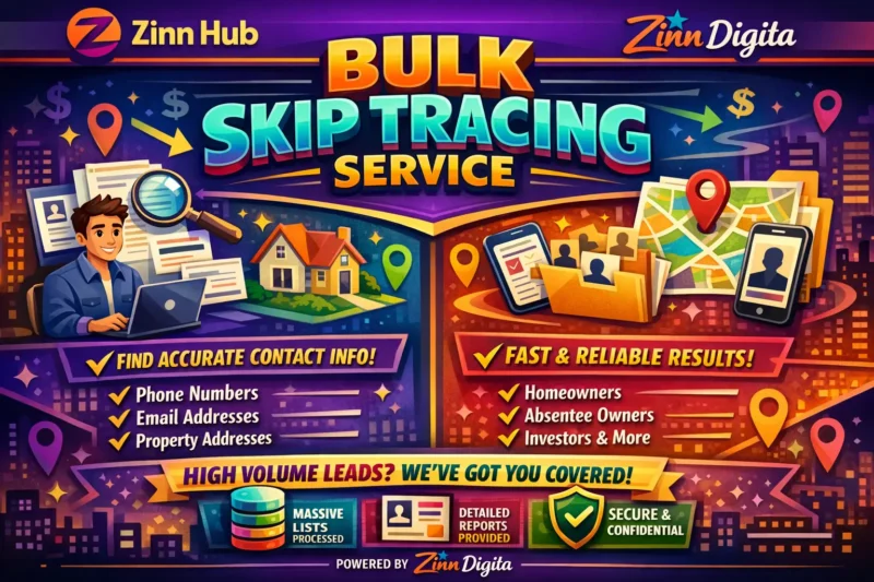 Welcome to our Real Estate Skip Tracing service! With the capability to process up to 50,000 records within just 24 hours, we employ top-tier skip tracing tools to ensure accurate and reliable homeowner information retrieval. Let us help you streamline your real estate endeavours with swift and precise data acquisition. Trust Zinn Digital ™ to deliver comprehensive insights for your property needs.