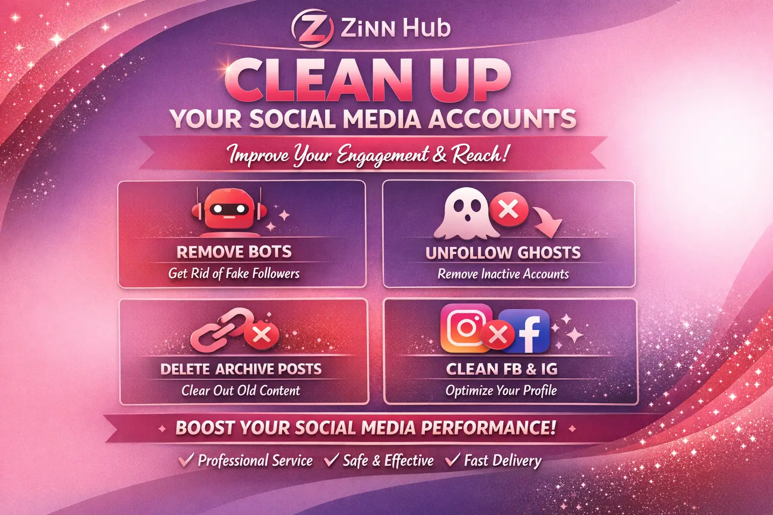Is your social media engagement dropping despite a high follower count? The truth is, bot accounts, ghost followers, and outdated archived posts can negatively impact your profile's performance and credibility. These inactive or fake users distort your analytics, reduce your engagement rate, and make it harder for you to reach genuine followers. Whether you're an influencer, brand, or business owner, a clean and authentic audience is key to growing your online presence effectively.
