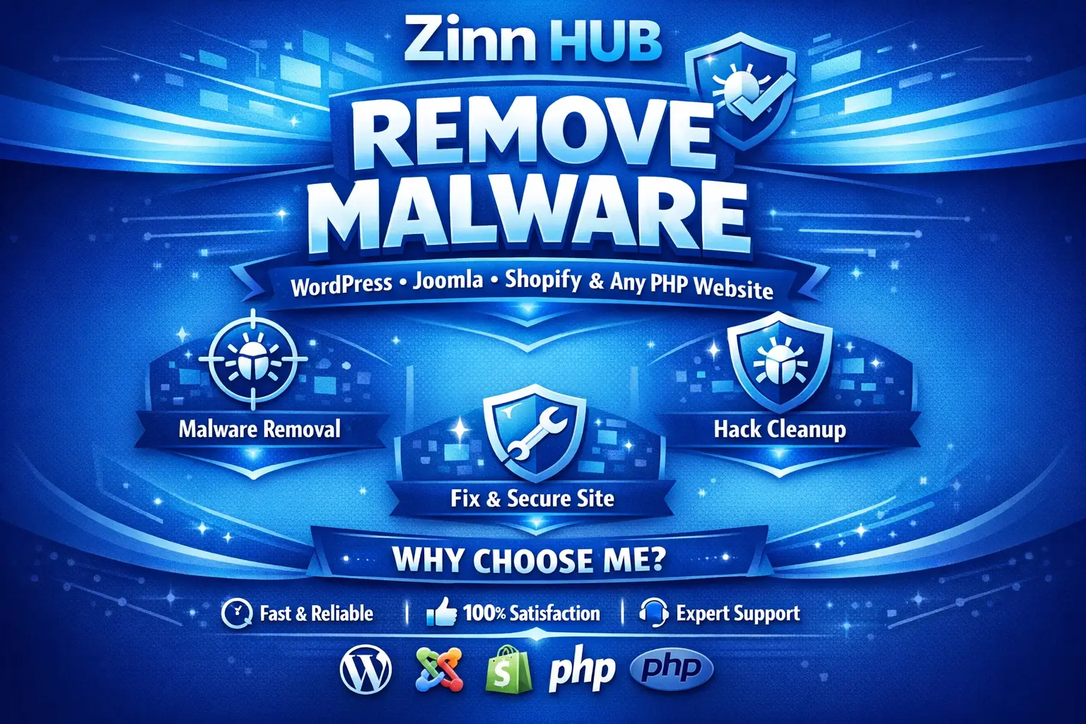 remove malware wordpress, joomla, shopify, any PHP website