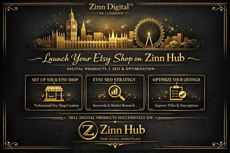Based in London, England, Zinn Digital™ specialises in **digital product design and Etsy marketing**, helping sellers improve **Etsy SEO, shop setup, product promotion, & listing optimisation**.