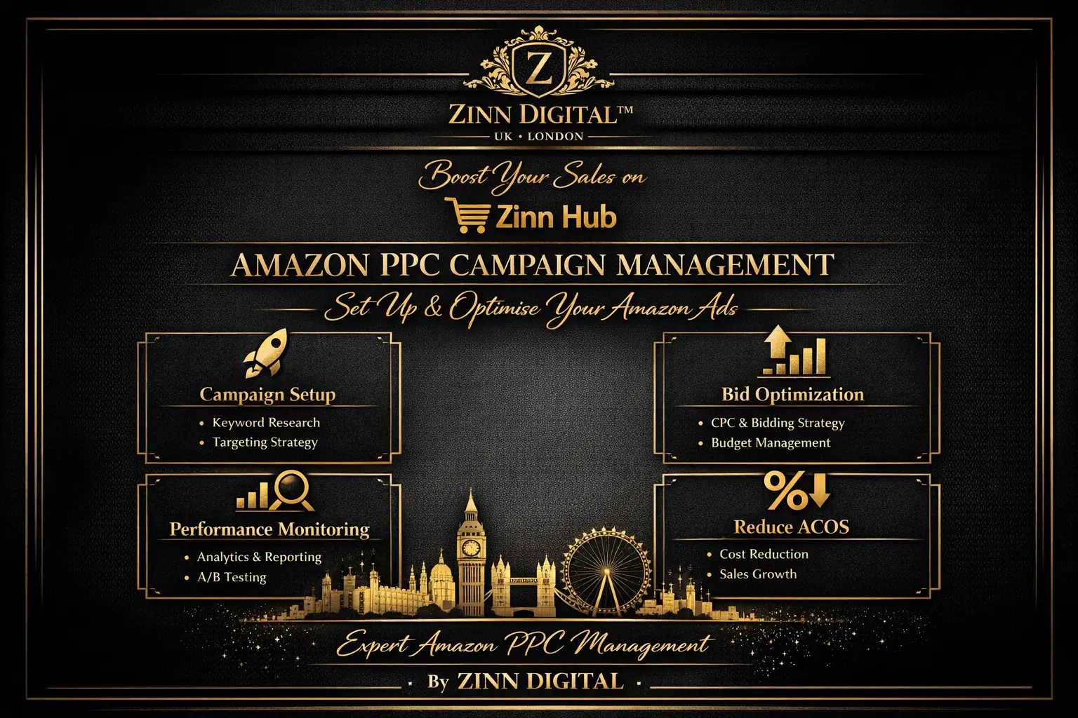Your ideal Amazon PPC budget depends on your niche, competition level, and business goals. We recommend starting with £30–£50/day per product to gather sufficient data for effective optimisation. For highly competitive categories, a higher budget may be necessary. Our London-based team at Zinn Digital ™ will guide you to spend intelligently and maximise ROI from day one.