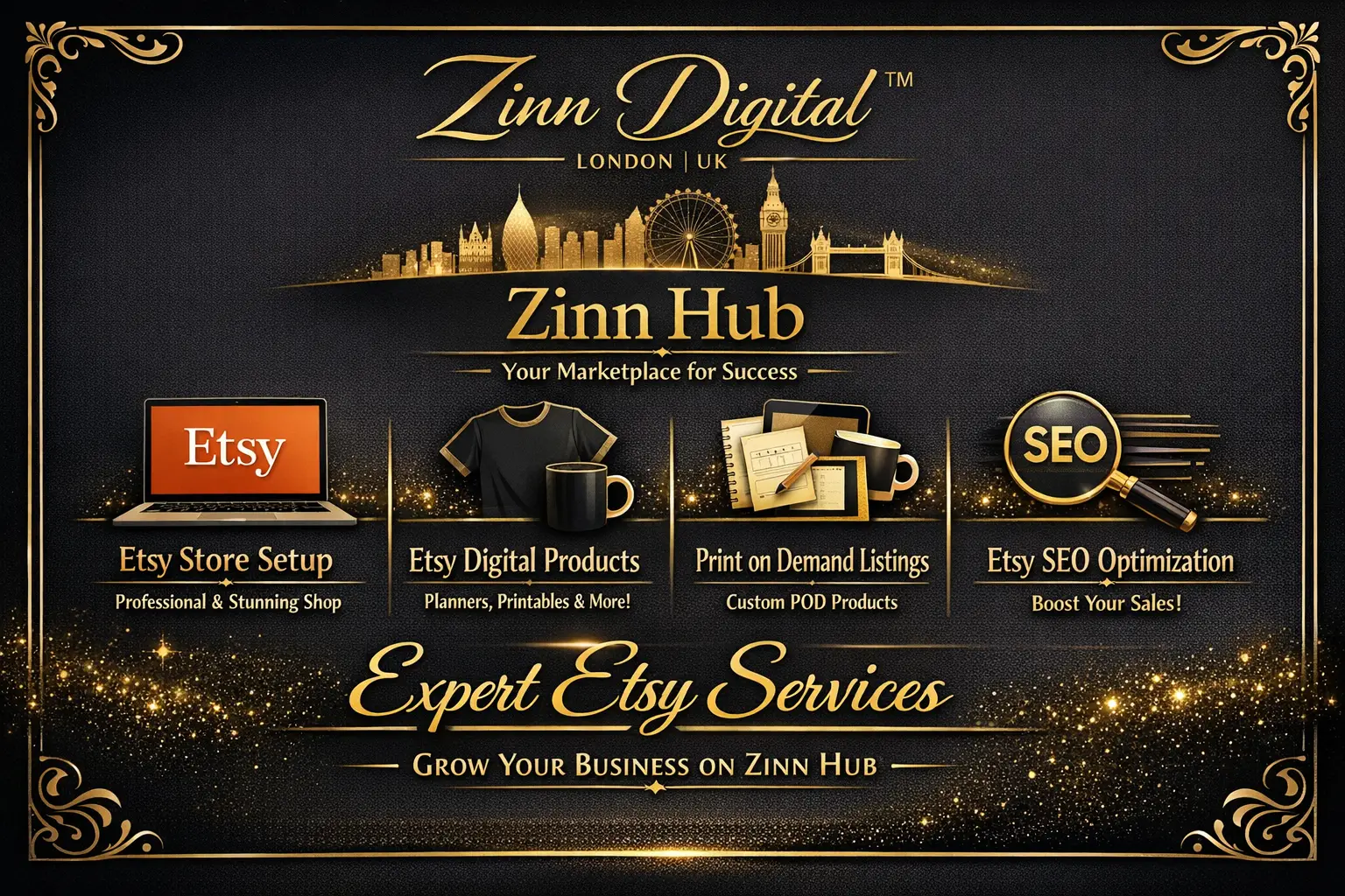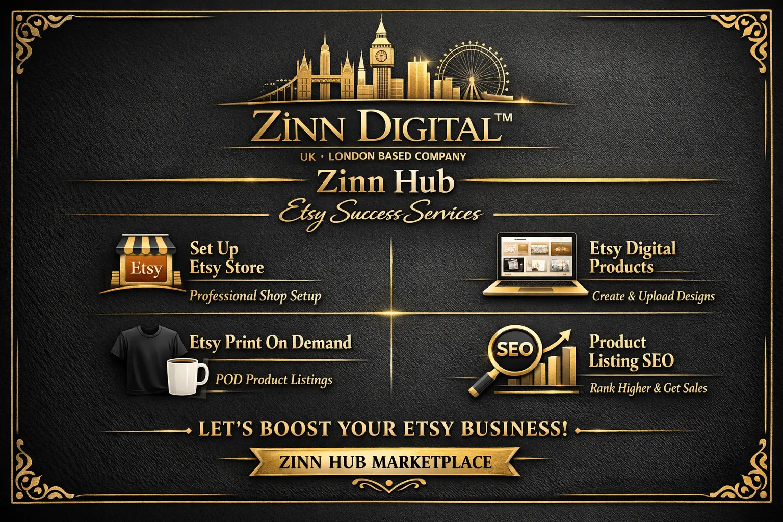 Is your Etsy shop struggling to gain visibility in a competitive marketplace? Looking to increase sales and elevate your online business? Look no further! Zinn Digital™ offers comprehensive expertise in Etsy product design, SEO optimisation, print-on-demand branding, and shop branding. We'll help you boost your visibility, attract more customers, and grow your shop successfully from our base in London, England.