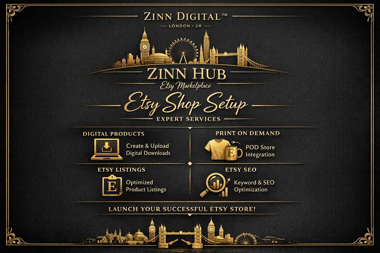 At Zinn Digital™, we professionally establish your Etsy shop with a specialised focus on digital products, print-on-demand services, and optimised Etsy listings designed to drive conversions and generate consistent sales.