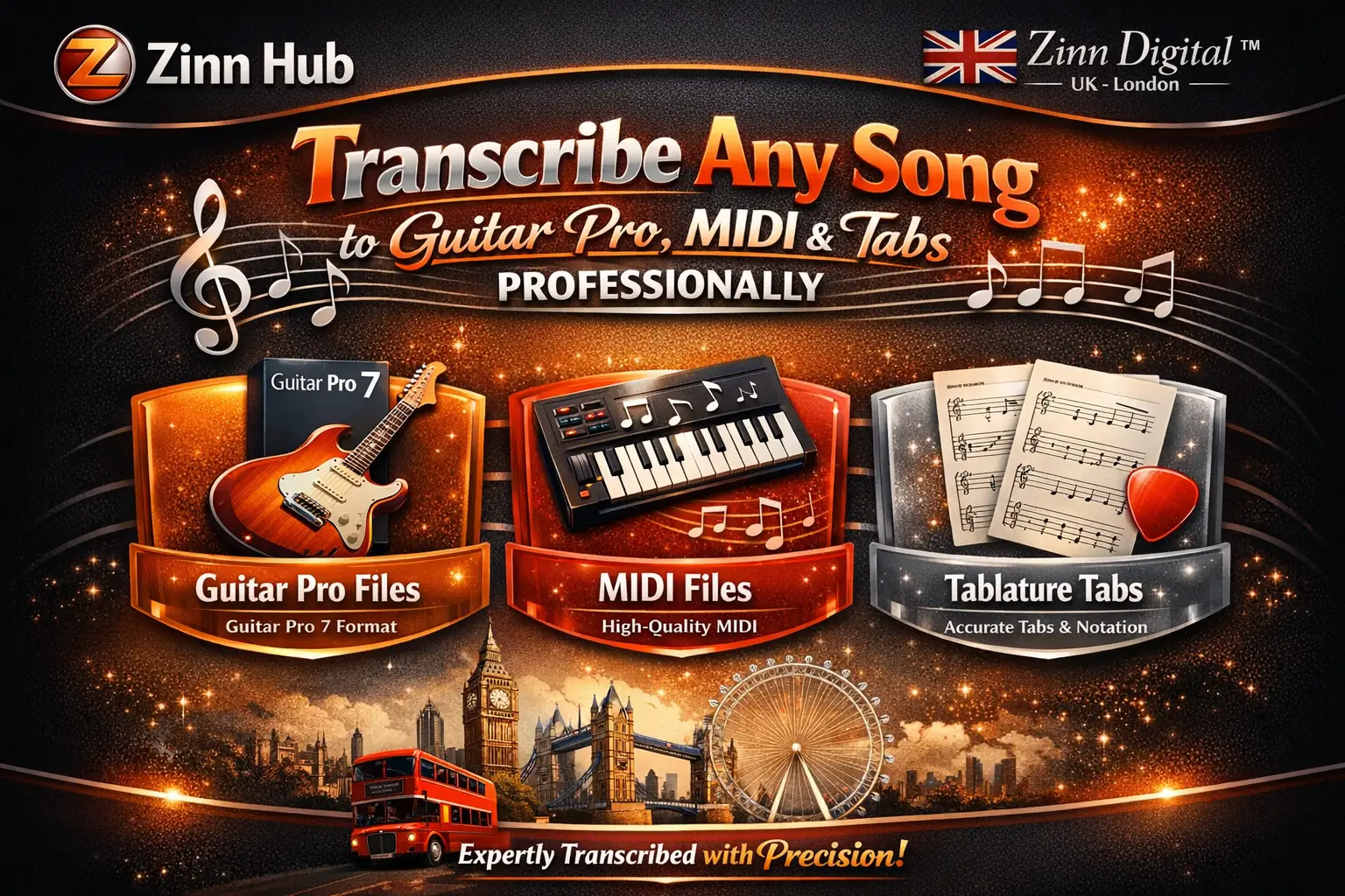 Zinn Digital™ specialises in crafting accurate professional Guitar Pro transcriptions from our base in London, England. From intricate solos and rhythm parts to full-band arrangements with synced lyrics and tempo maps, we turn audio chaos into precise sheet music and tabs ready for practice, performance, or studio work.