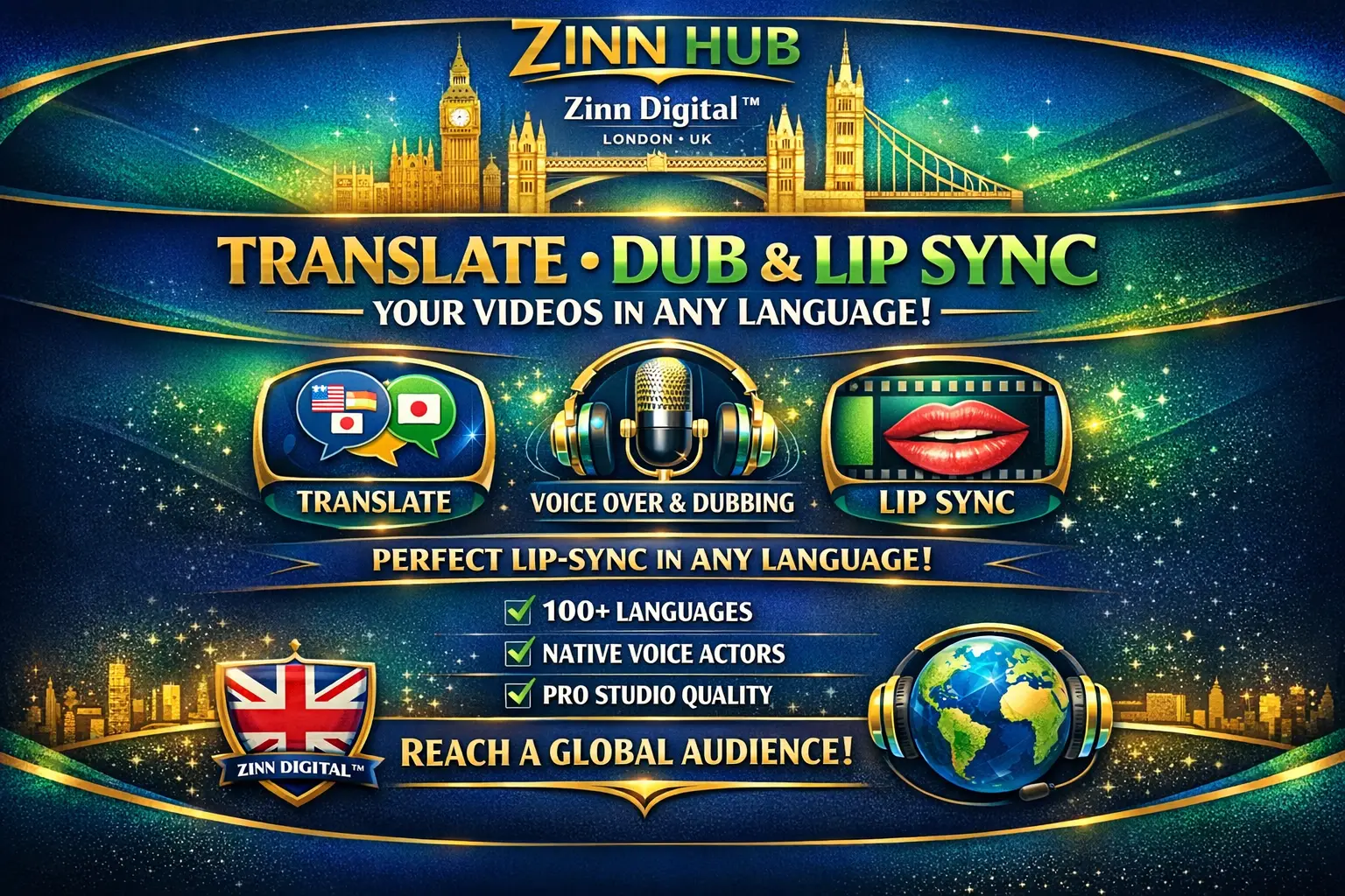 With years of expertise in AI voice technology, Zinn Digital ™ delivers premium voice-over, translation, dubbing, and lip-sync services for videos and audio in any language from our London, England headquarters.