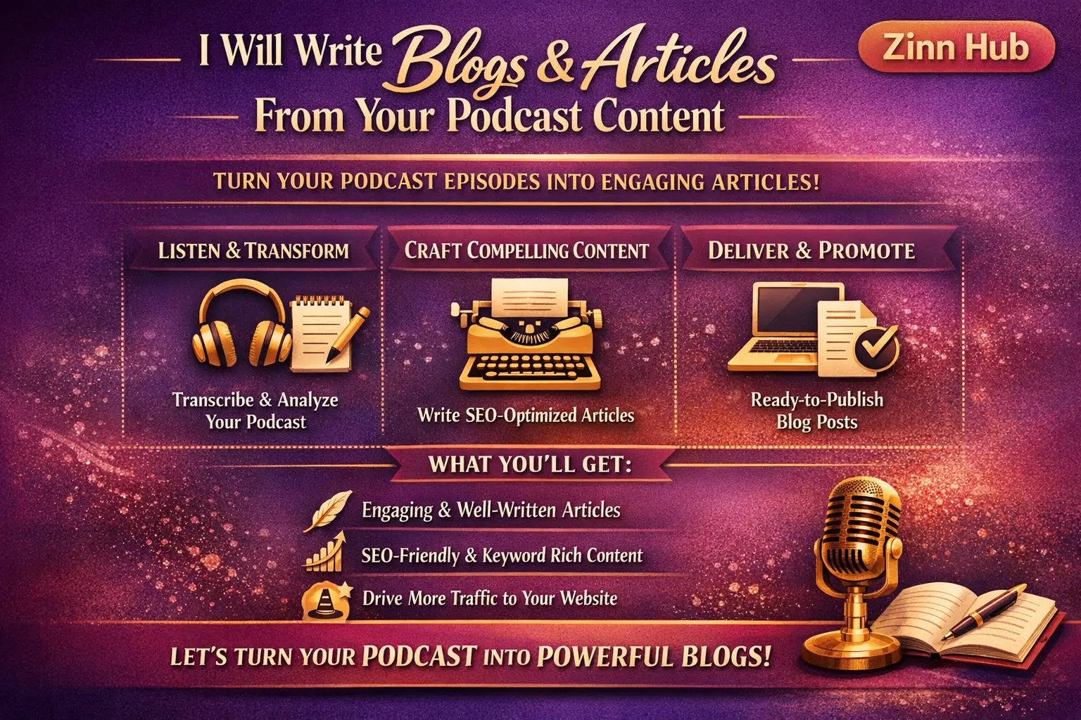 Are you looking to boost your podcast's reach and engagement? Combine it with powerful SEO copy! With this service, Zinn Digital ™ can take your podcast audio and video recordings and create vivid, engaging blog posts that capture the essence of your podcast.