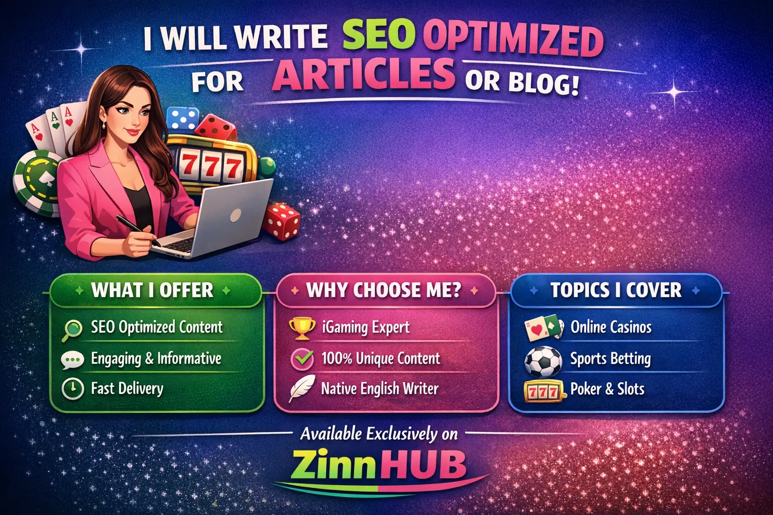 Welcome to my iGaming article and blog writing Zinn. Please message me before ordering!