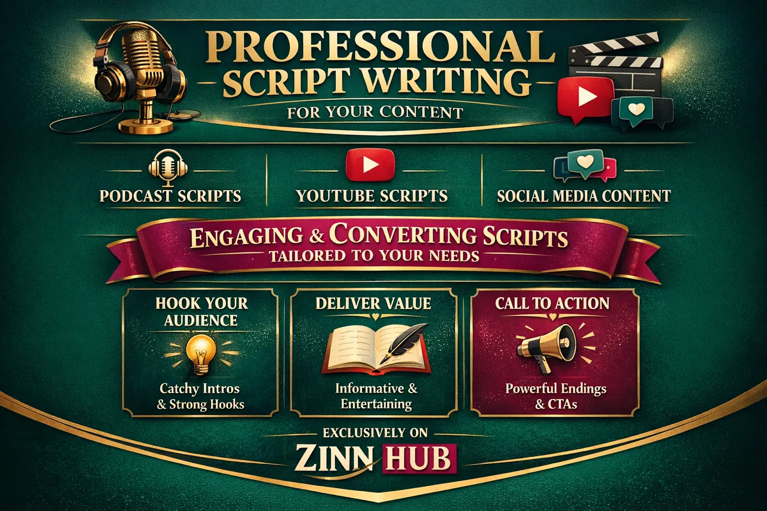 write your podcast script, youtube script, or social content